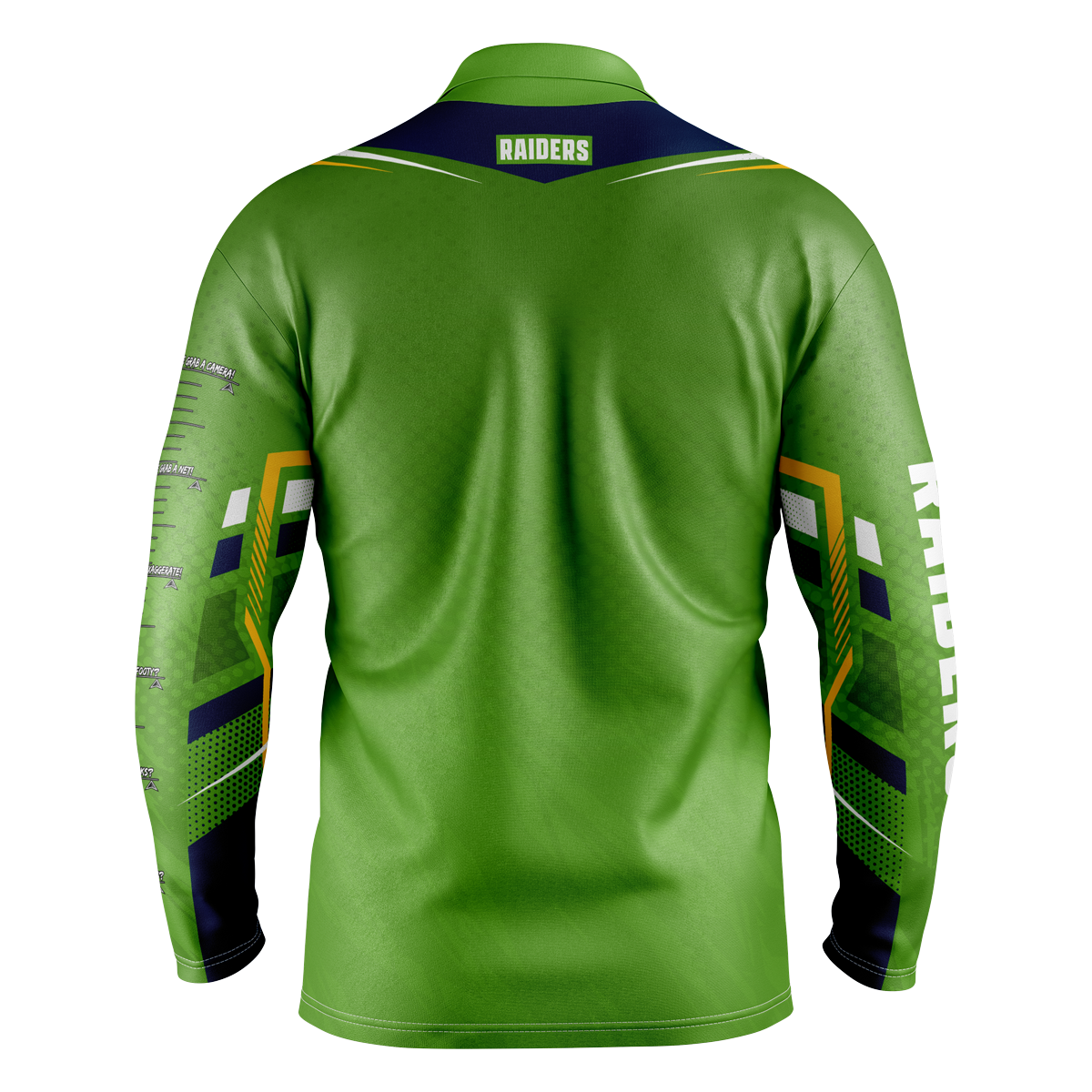 • Novelty fish measuring scale down left sleeve, and team name down right sleeve