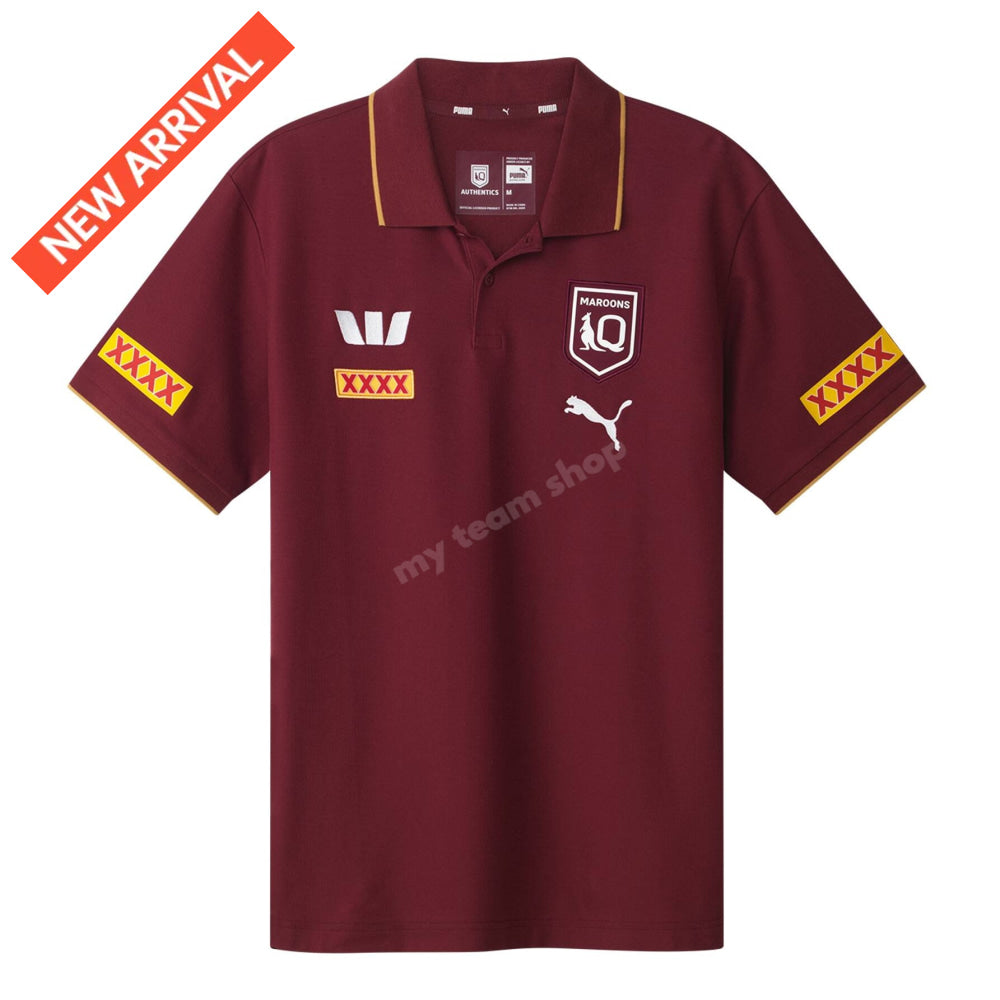 Finished with premium collar and cuff detailing, it proudly displays the official QLD Maroons crest alongside PUMA branding and authentic sponsor logos. The flat knit collar adds a polished look, making it ideal for match days, training sessions or casual wear.