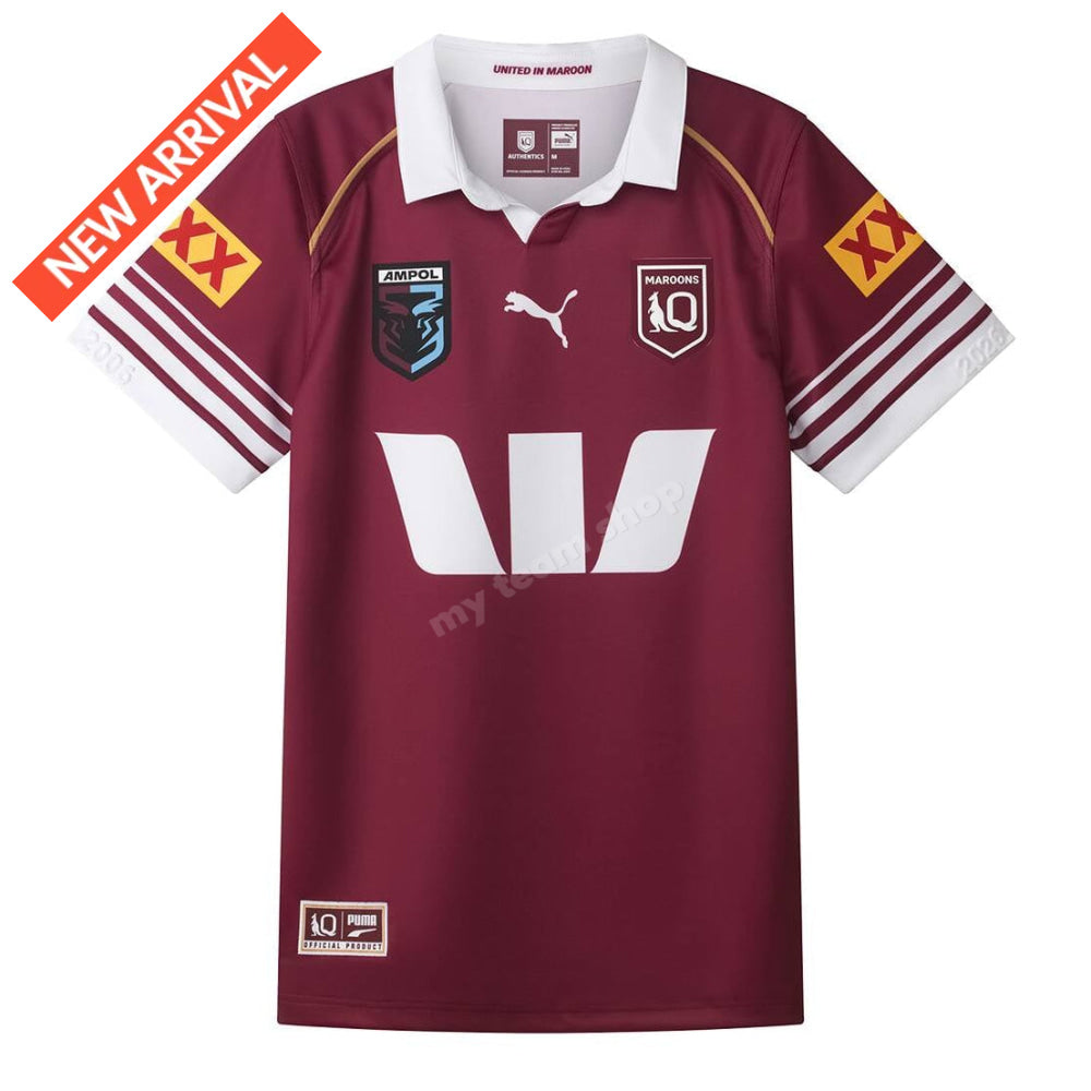 The 2026 Queensland Maroons Jersey blends heritage with a modern edge. Striped sleeves honour the iconic 2006 design, while 2006 and 2026 embossing marks 20 years since the eight-straight era began. Gold piping returns for a bold highlight, and inside the collar, the rallying call “United in Maroon” unites all Queenslanders. Built for performance and pride.