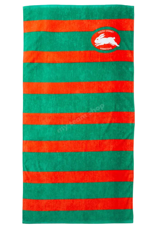 Celebrate the legacy of the game's oldest club with the South Sydney Rabbitohs NRL Retro Beach Towel. Featuring traditional red and green stripes and the classic Rabbitohs logo, this towel is a must-have for passionate fans. Made from soft, absorbent fabric and sized for comfort, it’s perfect for beach days, gym sessions, or post-match recovery.